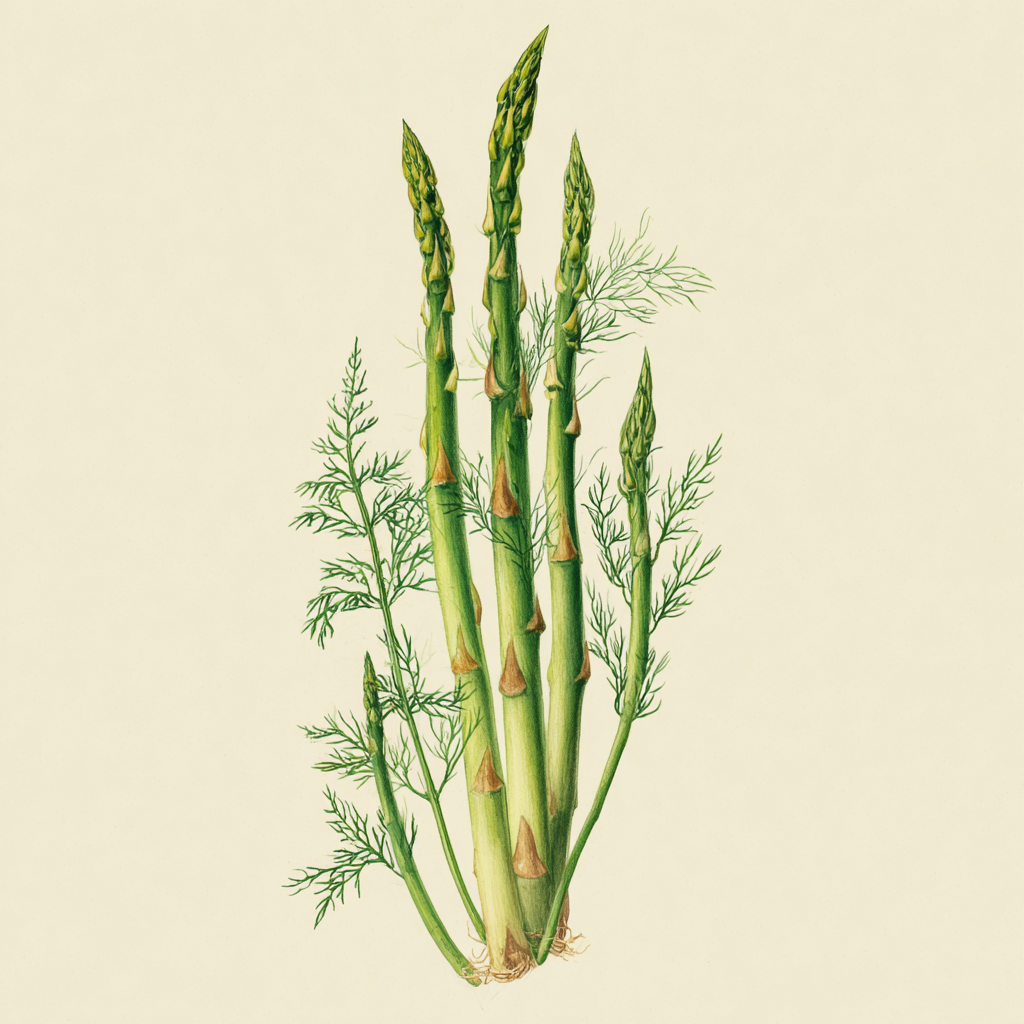 Asparagus roots appear in European herbals from the medieval period through the 18th century, valued primarily as a diuretic. The officinalis designation in the species name reflects this historical place in apothecary stores. These references are culinary-adjacent rather than strictly medicinal - older writers often treated asparagus as a food with notable household utility rather than a medicine proper.