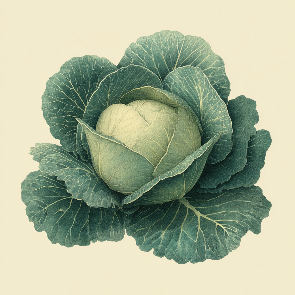Cabbage is a head-forming selection of Brassica oleracea - the same species that, under different selective pressures, gave rise to kale, broccoli, cauliflower, kohlrabi, Brussels sprouts, and collards. Its wild ancestor still grows on chalk and limestone sea cliffs along the Atlantic coast of western Europe, from southern England and Wales through northern France to the Iberian Peninsula, where the loose leafy non-heading form survives in exposed coastal conditions. The Greeks and Romans both cultivated brassicas extensively: Cato the Elder, writing in the 2nd century BCE, was a famous advocate who claimed cabbage could cure a remarkable range of ailments, and Pliny the Elder called it one of the most important vegetables of the Roman diet. The dense heading characteristic - overlapping leaves forming around a compressed growing point - was developed over centuries of selection and gave cabbage its defining practical advantage: a hard head that stores well, travels well, and ferments readily. This made it one of the most important winter food crops of northern and central Europe for centuries. The discovery that fermented cabbage could prevent scurvy - by preserving enough vitamin C through fermentation - had significant practical consequences: Captain Cook carried over two tonnes of sauerkraut on his Pacific voyages in the 1770s and reported virtually no scurvy cases.