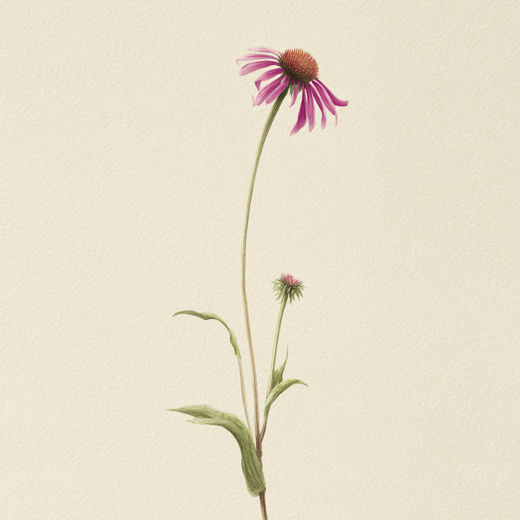 Echinacea purpurea is native to the central and eastern United States, growing in open woods, prairies, and disturbed areas from Missouri and Ohio south through the Appalachians. The genus name comes from the Greek echinos - hedgehog - referring to the spiny central cone. Nine Echinacea species are recognized across North America, most native to the Great Plains; their deep perennial taproots are adapted to the cycle of prairie drought and fire, persisting through multiple seasons of surface disturbance. Echinacea angustifolia, the narrow-leaved prairie coneflower, was the species most widely known to Plains nations and was the plant that entered 19th-century American herbal commerce. Wild-harvested Echinacea root was a significant component of late 19th-century American botanical medicine and overharvesting of wild populations near the turn of the 20th century was an early documented case of medicinal plant conservation concern. Echinacea purpurea's superior garden performance over E. angustifolia made it the dominant cultivated species and the focus of most modern phytochemical research.