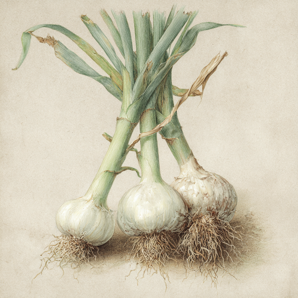 Have seeds for this? Add to inventory →Garlic is a powerful natural pest deterrent and one of the most valuable companion plants in the garden. Planted in autumn, it overwinters and is harvested the following summer when the lower leaves begin to brown.