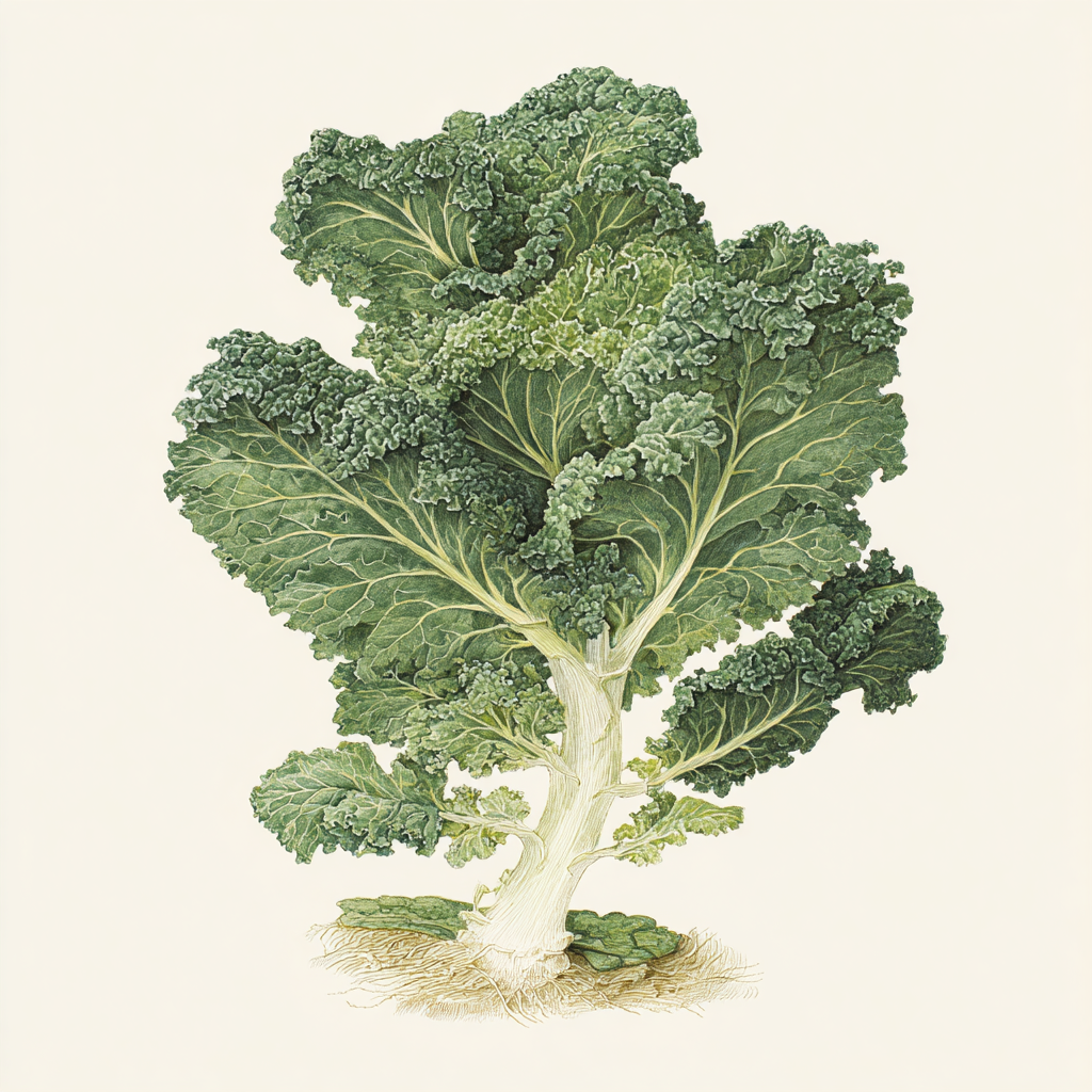 Brassica oleracea is one of the most extraordinary examples of artificial selection in botany - a single wild coastal species whose different cultivated forms include kale, cabbage, broccoli, cauliflower, kohlrabi, Brussels sprouts, and collard greens, each representing selection pressure applied to a different part of the plant over centuries. Wild Brassica oleracea still grows on the limestone sea cliffs of Britain and Brittany; it is a modest, unremarkable small shrub that gives little hint of its descendants. Kale and collard-type forms - selected for leafy growth rather than heads or modified flower buds - are among the oldest domesticated brassicas, likely cultivated around the Mediterranean from Greek and Roman times. In Scotland, kale was so fundamental to the peasant diet for centuries that the kitchen garden was called a kail yard, and the word kail was used generically for any cooked greens. The phrase "dinner o' kail" was simply the Scots word for the evening meal. The 21st-century kale revival - driven by interest in its glucosinolate chemistry, mineral density, and eye pigments - is historically unusual in restoring a medieval peasant staple to elite cultural status.