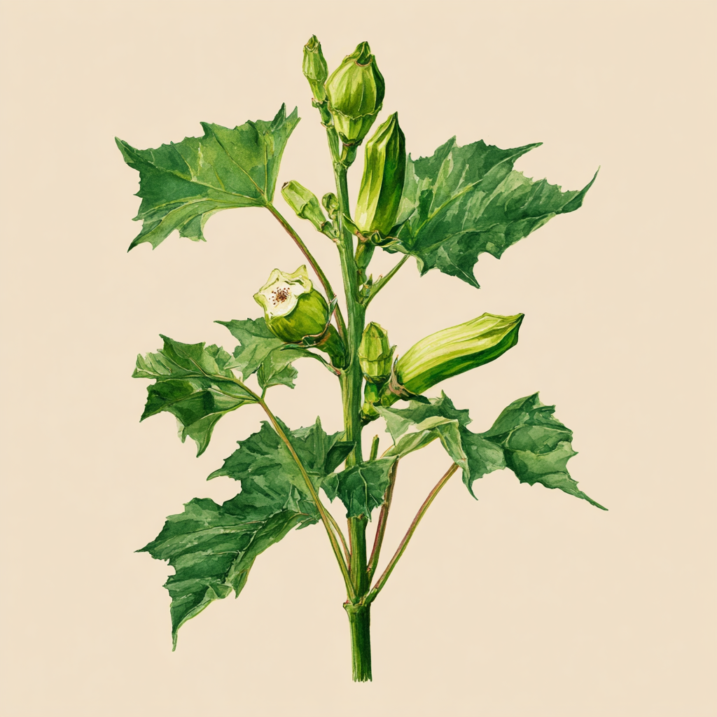 Abelmoschus esculentus is a member of the mallow family (Malvaceae) and a close relative of hibiscus, cotton, and hollyhock. Its geographic origin is debated between West Africa (specifically the region of modern Ethiopia and Eritrea) and South Asia - possibly with independent selection in multiple regions. The earliest clear documentation comes from 12th-century Egypt, where it was described growing along the Nile by Arab botanists. Okra reached the Mediterranean world via Arab trade routes and appears in 13th-century Moorish Spanish agricultural manuscripts. Its most historically significant movement was the forced transport of enslaved Africans to the Americas from the 16th century onward; okra arrived in the Caribbean and southern United States carried by enslaved West Africans who brought seeds with them and preserved the plant and its culinary traditions against profound adversity. The English word okra derives from the Igbo word ọkụrụ. The word gumbo - the Louisiana stew synonymous with okra - derives from the Bantu kingombo or ngombo, tracing its origin to enslaved Congolese and Angolan Africans in Louisiana.
